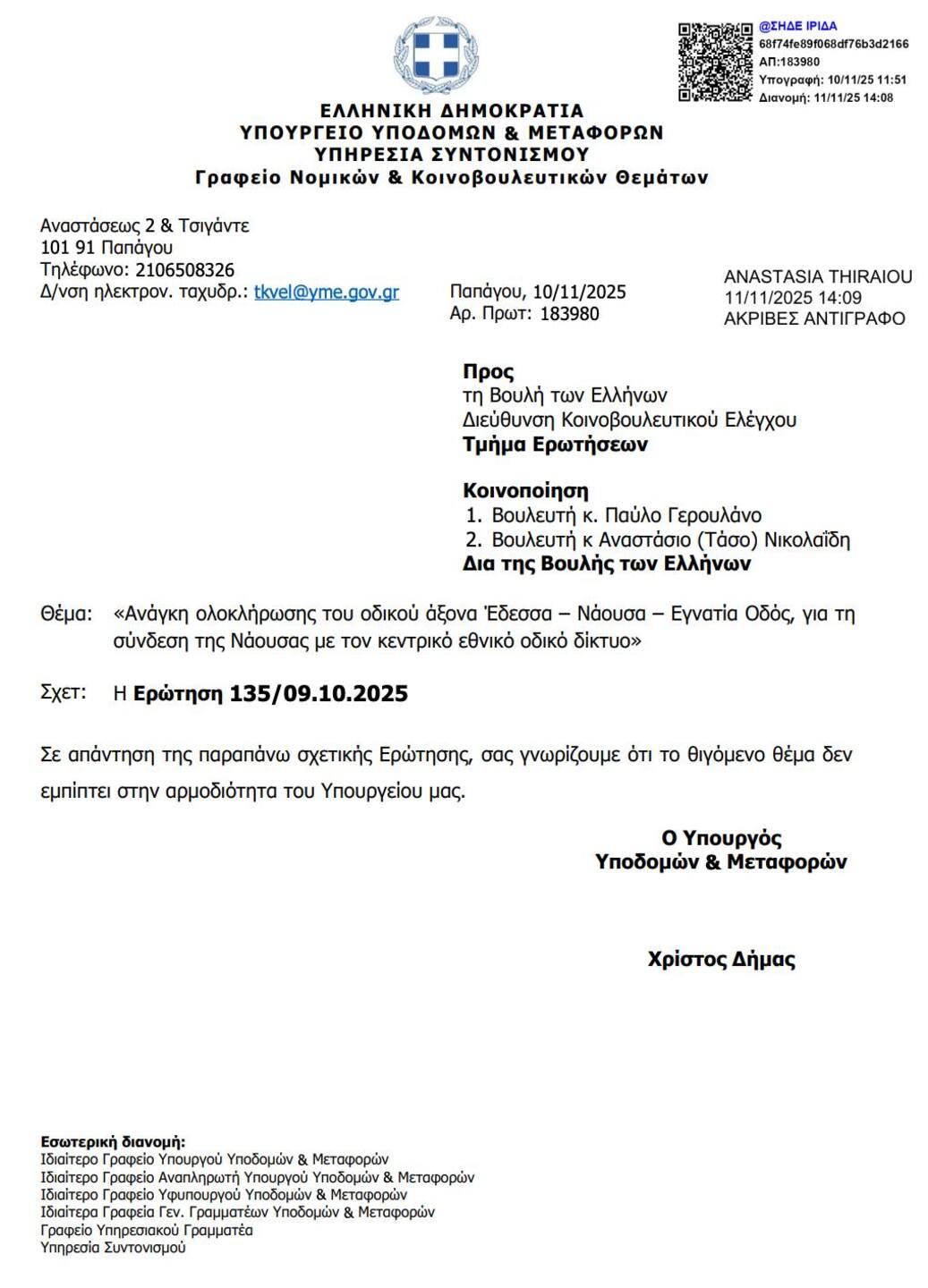 Δύο μήνες πριν ο προϊστάμενος Υπουργός του κου Ταχιάου, ο κος Δήμας απαντάει ορθά με τον πιο επίσημο τρόπο σε κοινοβουλευτική ερώτηση του ΠΑΣΟΚ και των Βουλευτών Παύλου Γερουλάνου και Τάσου Νικολαϊδη ότι το θέμα δεν εμπίπτει στην αρμοδιότητα του Υπουργείου (στη φωτό η απάντηση).