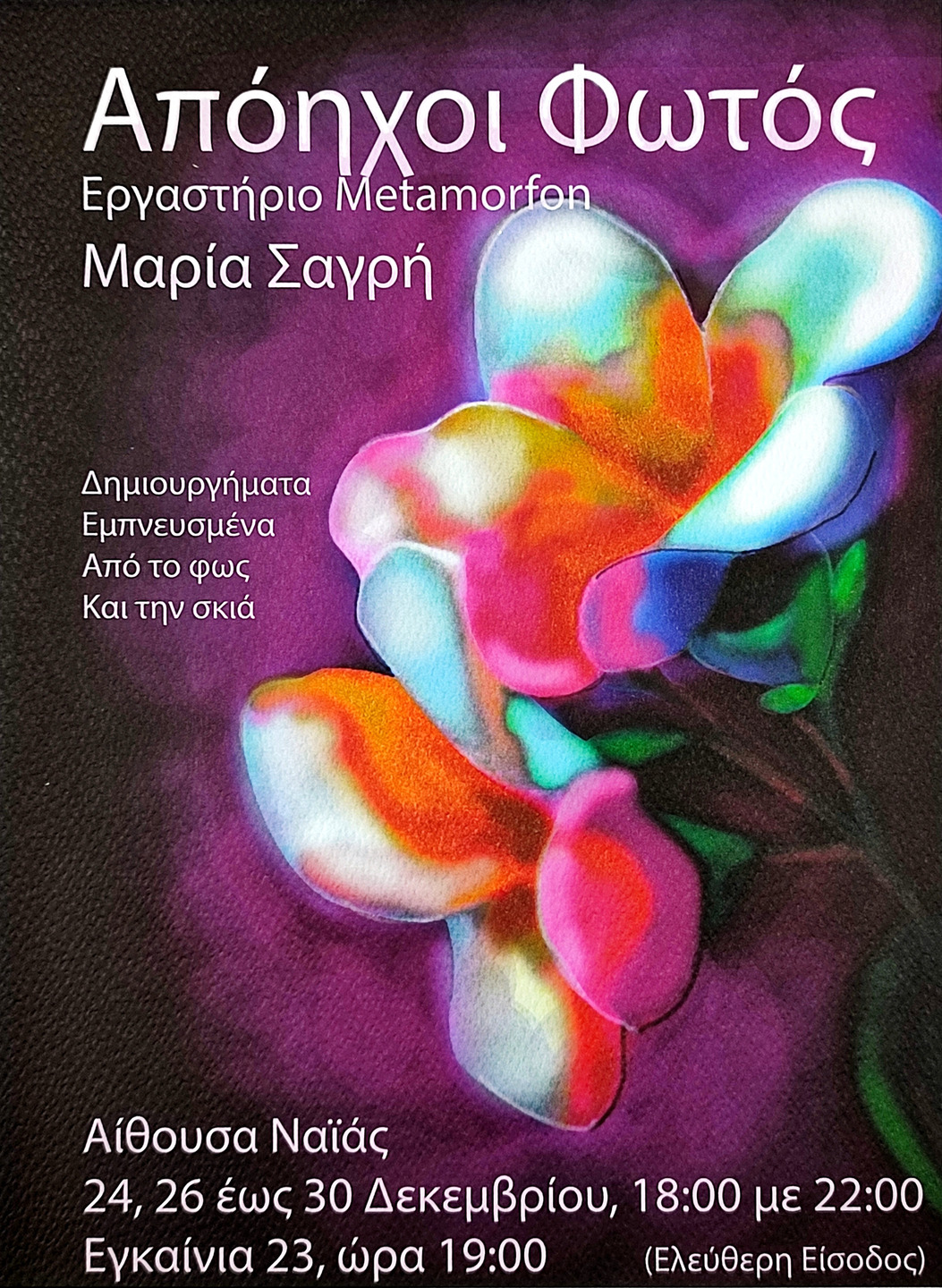 Την περίοδο των Χριστουγέννων, στην Αίθουσα Ναϊάς θα παρουσιαστεί η εικαστική έκθεση «Απόηχοι Φωτός».