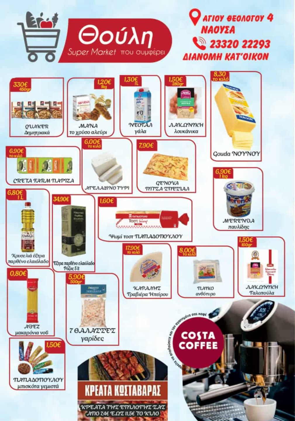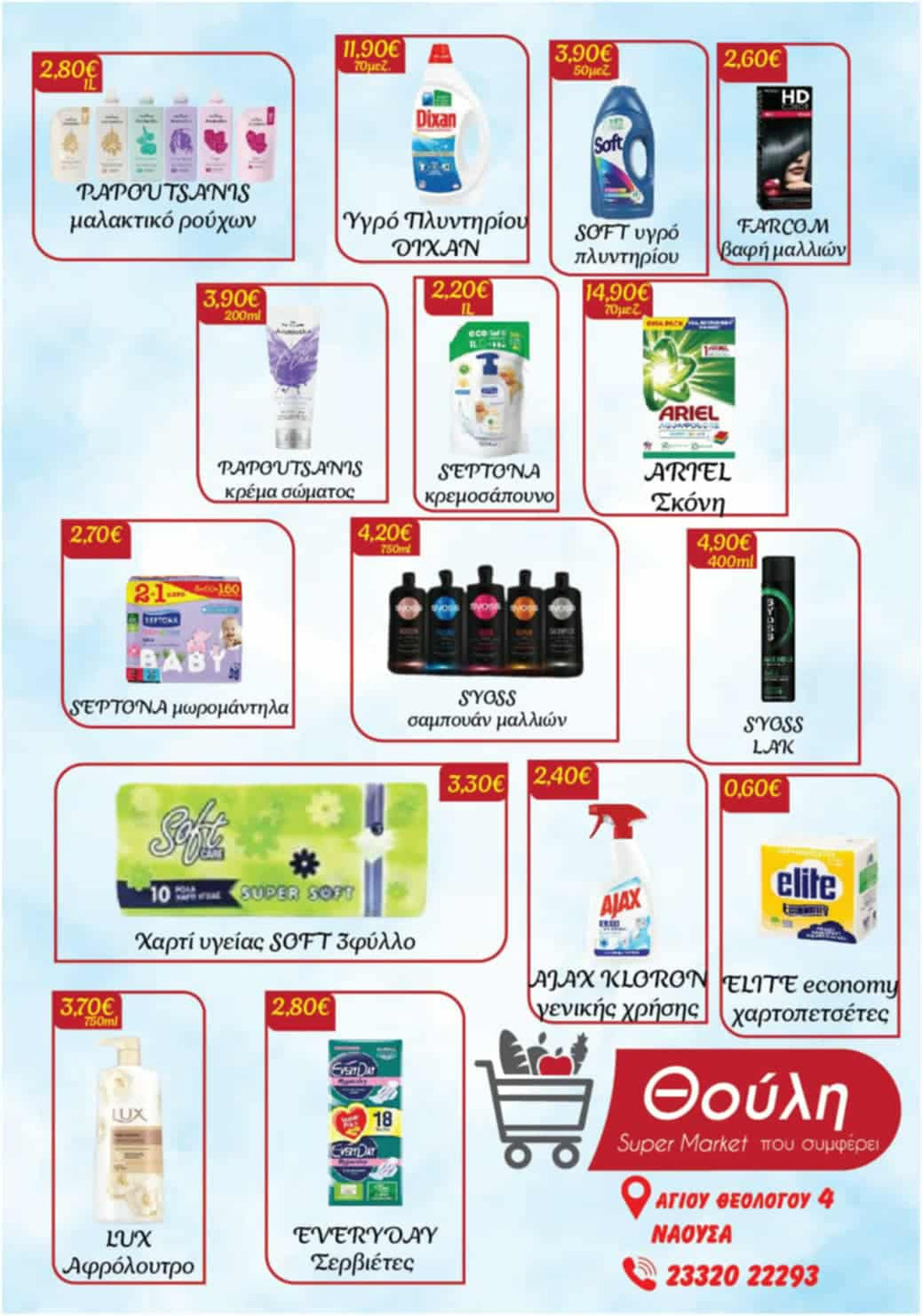 Κυκλοφόρησε το νέο φυλλάδιο με νέες ΣΟΥΠΕΡ ΤΙΜΕΣ από το Σούπερ Μάρκετ 'ΘΟΥΛΗ΄που βρίσκεται στην οδό Αγίου Θεολόγου 4 (Τηλ. 2332022293).