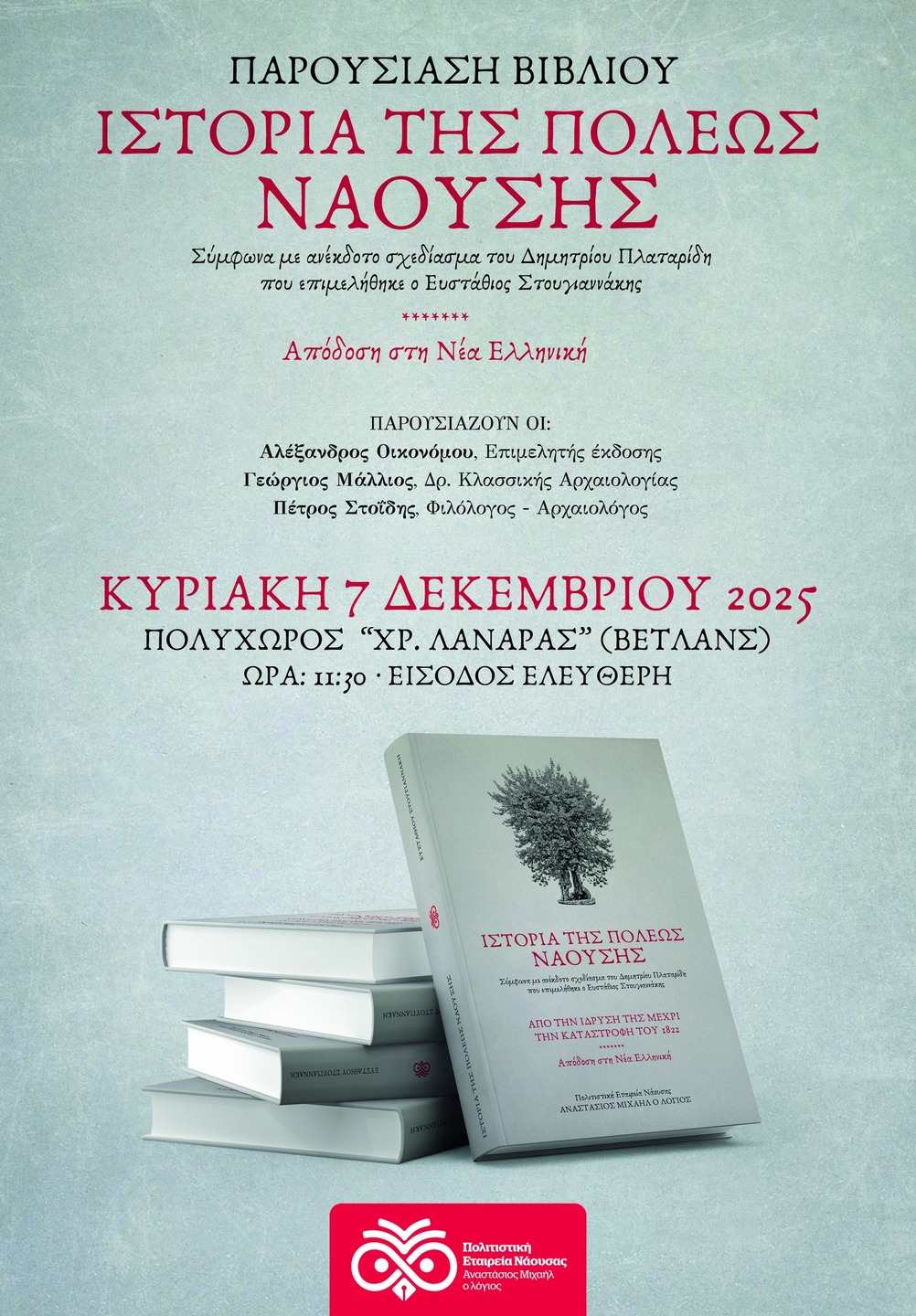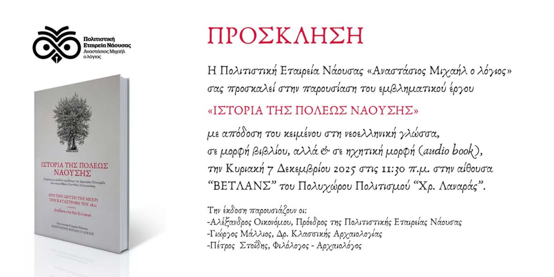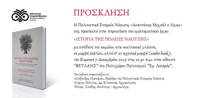 Παρουσίαση του εμβληματικού έργου 'ΣΤΟΡΙΑ ΤΗΣ ΠΟΛΕΩΣ ΝΑΟΥΣΗΣ' με απόδοση του κειμένου στη νεοελληνική γλώσσα σε μορφή βιβλίου και σε ηχητική μορφή θα πραγματοποιηθέι την Κυραική 7 Δεκεμβρίου στις 11.30 π.μ. την αίθουσα "Βέτλαςν" του Πολυχώρου Πολιτισμού "Χρ. Λαναράς" , από την Πολιτιστική Εταιρεία "Αναστάσιος Μιχαήλ ο Λόγιος".