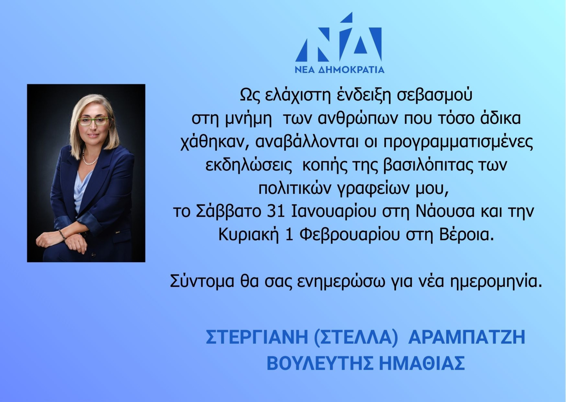 Ως ελάχιστη ένδειξη σεβασμού στη μνήμη των ανθρώπων που τόσο άδικα χάθηκαν, αναβάλλονται οι προγραμματισμένες εκδηλώσεις κοπής της βασιλόπιτας των πολιτικών γραφείων μου, το Σάββατο 31 Ιανουαρίου στη Νάουσα και την Κυριακή 1 Φεβρουαρίου στη Βέροια.