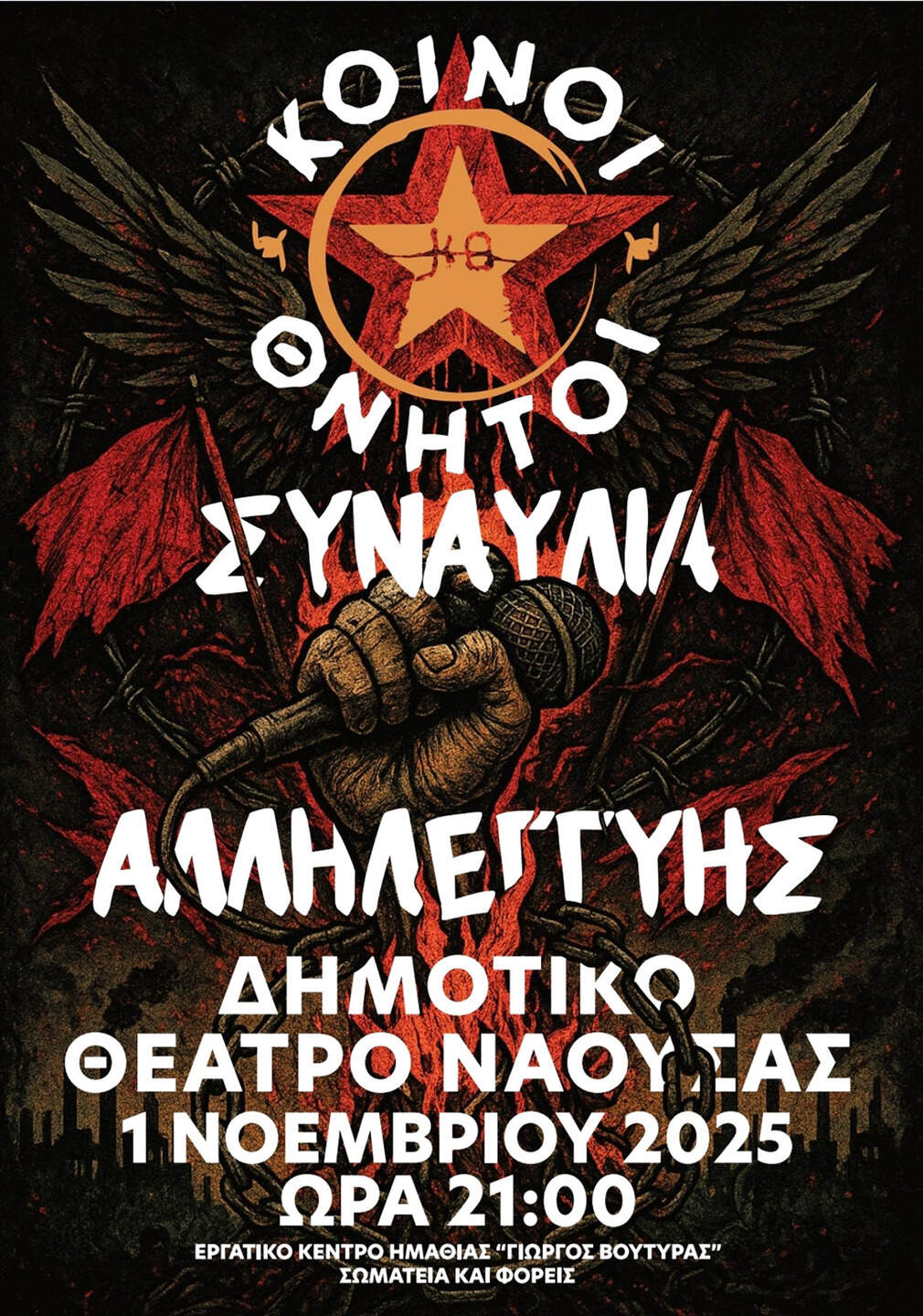 Συναυλία αλληλεγγύης με τους «ΚΟΙΝΟΥΣ ΘΝΗΤΟΥΣ» διοργανώνει το Σάββατο 1 Νοεμβρίου στις 9 μ.μ. στο Δημοτικό Θέατρο Νάουσας, το Εργατικό Κέντρο Ημαθίας και καλεί όλους τους εργαζόμενους του νομού, τη νεολαία, τα σωματεία να στηρίξουν αυτή την πρωτοβουλία από την οποία επιδιώκει: