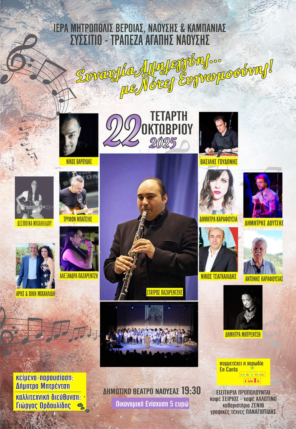 Το Συσσίτιο – Τράπεζα Αγάπης Ναούσης σε συνεργασία με το Ωδείο της Ιεράς Μητροπόλεως και υπό την αιγίδα της Ιεράς Μητροπόλεως Βεροίας, Ναούσης και Καμπανίας και του Δήμου Ηρωικής Πόλεως Ναούσης διοργανώνει μια ξεχωριστή Συναυλία με τίτλο: «Συναυλία Αλληλεγγύης με Νότες Ευγνωμοσύνης» με σκοπό την ενίσχυση του Συσσιτίου μας.