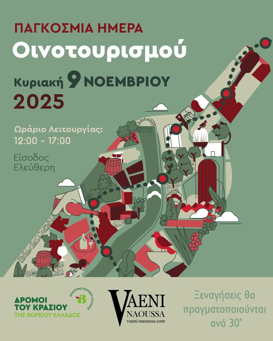 Την Κυριακή 9 Νοεμβρίου, το Vaeni Naoussa συμμετέχει στον εορτασμό της Παγκόσμιας Ημέρας Οινοτουρισμού και σας προσκαλεί να γνωρίσετε από κοντά τον κόσμο του κρασιού μέσα από μια ολοκληρωμένη οινοτουριστική εμπειρία.