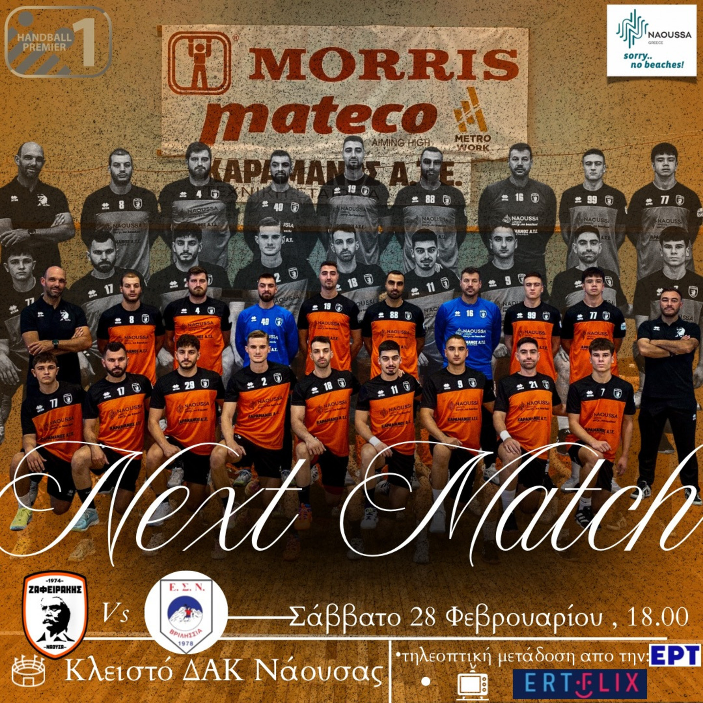 Ενα από τα πιο σημαντικά παιχνίδια της σεζόν απέναντι στα Βριλήσσια, δίνει το Σάββατο στις 6 μ.μ. στο κλειστό μας γυμναστήριο η ανδρική ομάδα Χαντ Μπωλ του “Ζαφειράκη”.